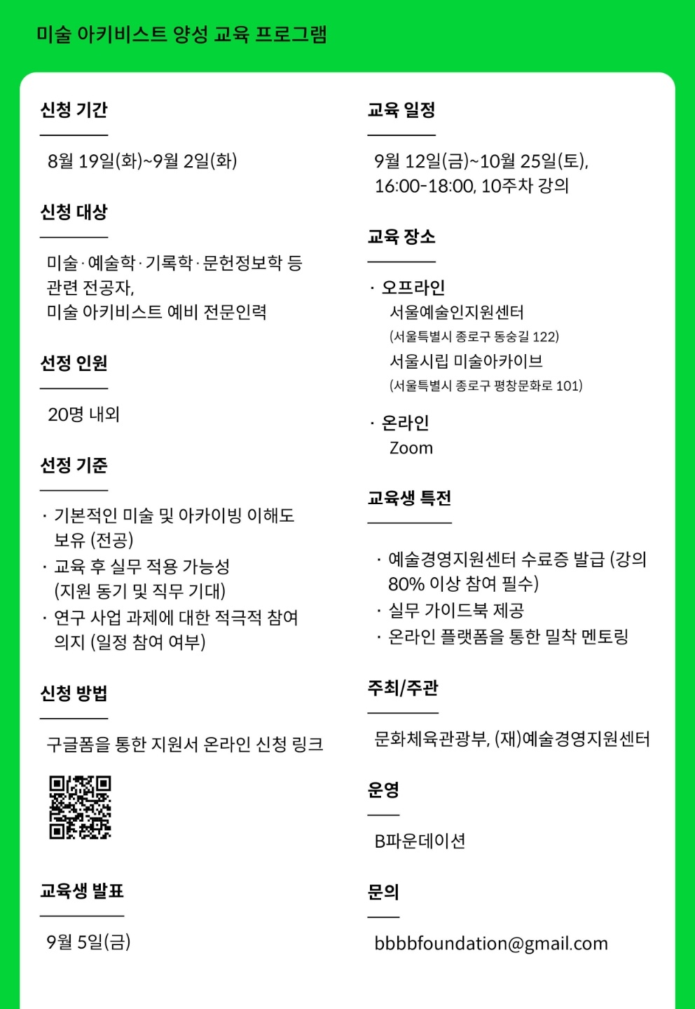 본 프로그램은 미술 및 기록 관련 전공자, 그리고 실무 진입을 희망하는 예비 아키비스트를 대상으로 하며, 실제 현장 수요를 반영한 실무 중심 커리큘럼으로 구성되어 있습니다. 미술 아키비스트로 도약하고자 하는 여러분의 많은 관심과 참여를 바랍니다. ●신청 기간: 2025년 8월 19일(화)~9월 2일(화) ●신청 대상: 미술사·예술학·기록정보학·문헌정보학 등 관련 전공자, 미술 아키비스트 예비 전문인력. ●선정 인원: 20명 내외 ●신청 방법: 구글폼을 통한 지원서 온라인 신청 - https://forms.gle/9WK3ianApyNpDhVCA ●교육생 발표: 9월 5일(금) |