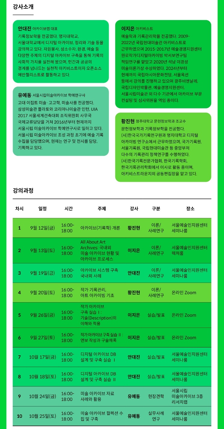 미술 아카이브의 지속적 보존과 공공적 활용을 위한 전문 인력 양성을 목표로, 미술 아키비스트 양성 시범 교육 프로그램을 운영합니다.