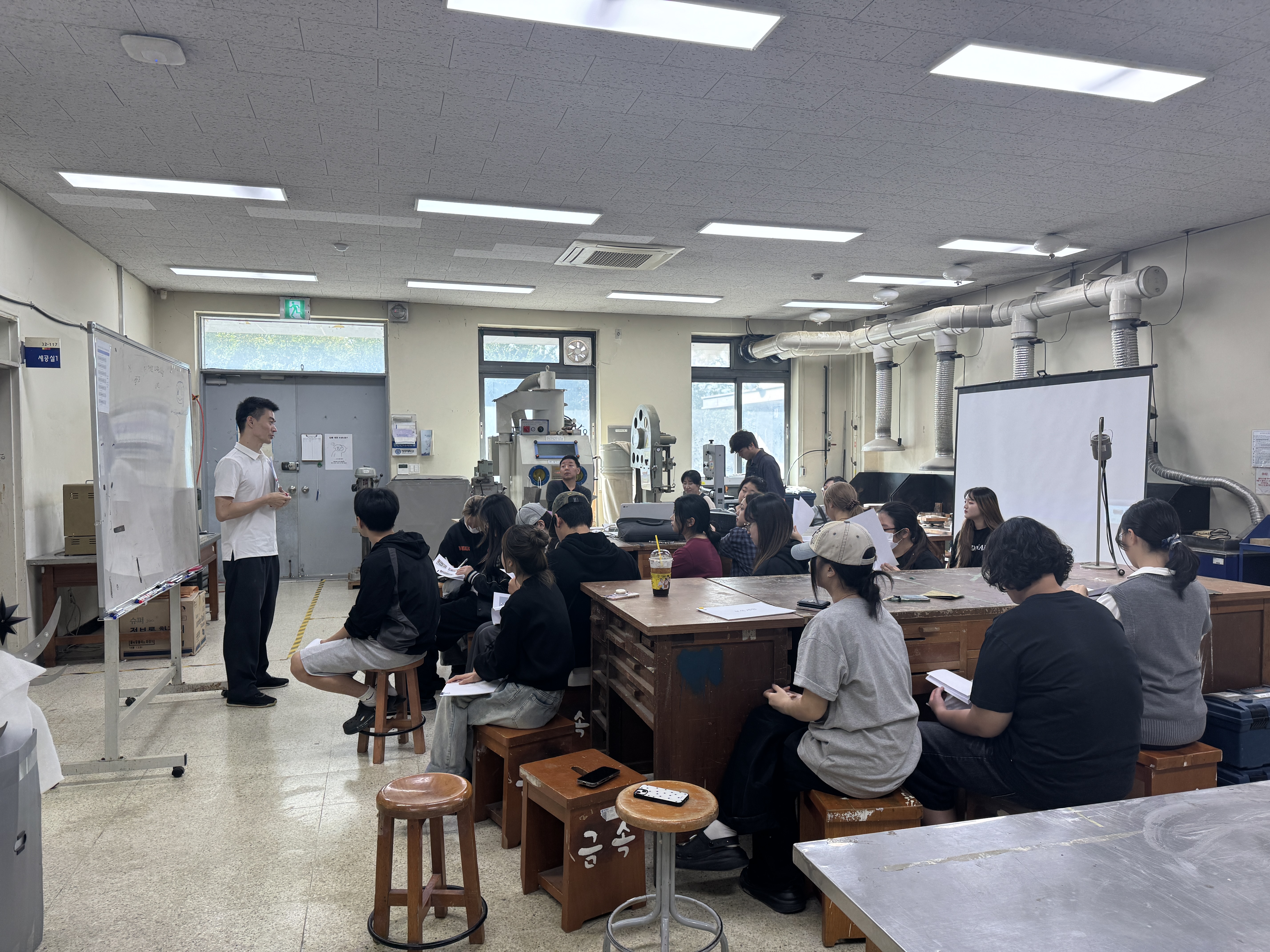 | 2025년 9월 23일 공예관 금속실에서 노도식 작가님의 비교과 특강이 진행되었습니다. 노도식 작가님은 도시트 대표이자 주얼리 디자이너 겸 세공사로 활동하고 계시며, 주얼리 공예 및 이론 강의와 주얼리 작업에 사용되는 다양한 도구 및 재료들을 소개하고 학생들과 함께 실습 결과물을 직접 만들어보며, 피드백 및 질의응답하는 시간을 가졌습니다. | |