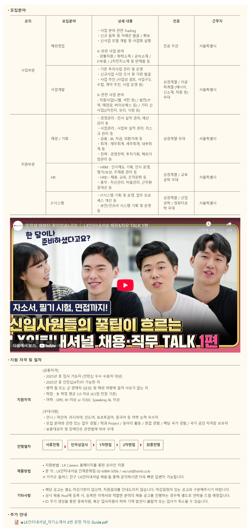 취업게시판 HOME 취업&진로 취업게시판 프린트 취업게시판 상세보기, 제목, 내용, 파일, 작성자등의 정보를 제공합니다. 제목 [LX인터내셔널] 2025년 신입사원 채용(~상시모집) 사진 확대보기 png 파일 참조 파일 [LX인터내셔널] 2025년 신입사원 상시 채용 .png 작성자 박해원 (영어영문학과) 목록 이전글 [포스코IH] 2025년 하반기 신입사원 채용 (~11/20) 다음글 [아시아나항공] 2026년 신입 인턴 객실승무원 채용 (~11/17)
