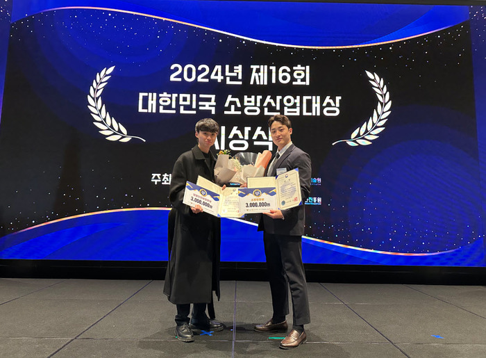 청주대학교 산업디자인학과 3학년 이호영(왼쪽)학생과 4학년 김재원 학생이 '대한민국소방산업대상'에서 수상한 뒤 기념사진을 촬영하고 있다.(청주대 제공)/뉴스1