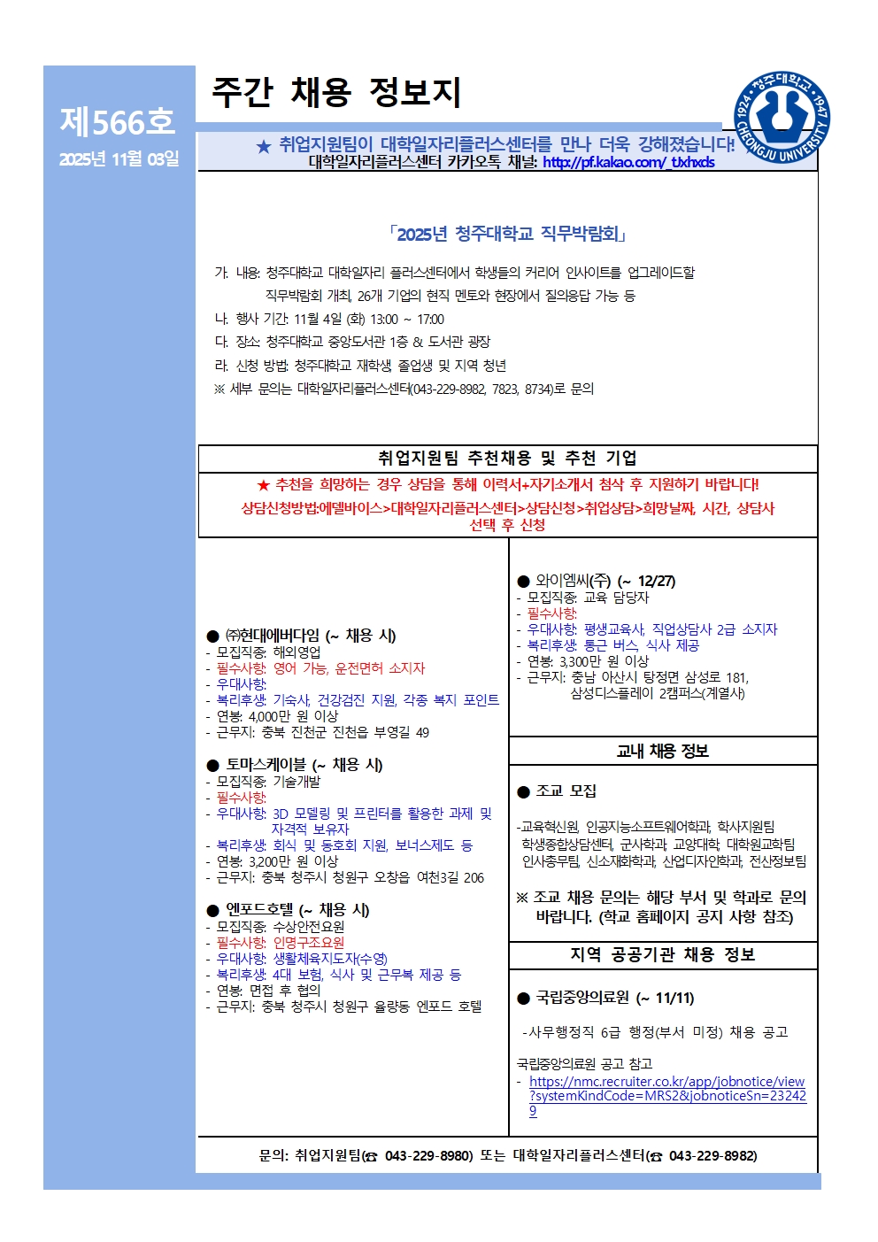 취업게시판 HOME 취업&진로 취업게시판 프린트 취업게시판 상세보기, 제목, 내용, 파일, 작성자등의 정보를 제공합니다. 제목 채용정보 소식지 제566호 사진 확대보기 채용정보 소식지 제566호입니다. 파일 채용정보 소식지 제566호.jpg 작성자 복재엽 (수학교육과) 목록 이전글 채용정보 소식지 제567호 다음글 채용정보 소식지 제565호