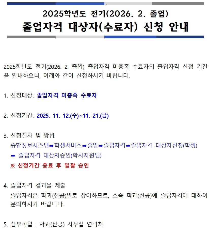 학과소식 HOME 열린마당 학과소식 프린트 학과소식 상세보기, 제목, 내용, 파일, 작성자등의 정보를 제공합니다. 제목 2025학년도 전기(2026. 2. 졸업) 졸업자격 대상자(수료자) 신청 안내 사진 확대보기 . 파일 20251107155435064yB7.jpg 작성자 무역학과 목록 이전글 2025학년도 전공탐색 설명회 다음글 2025학년도 무역학과 졸업생 릴레이 특강 및 자격증 특정 일정