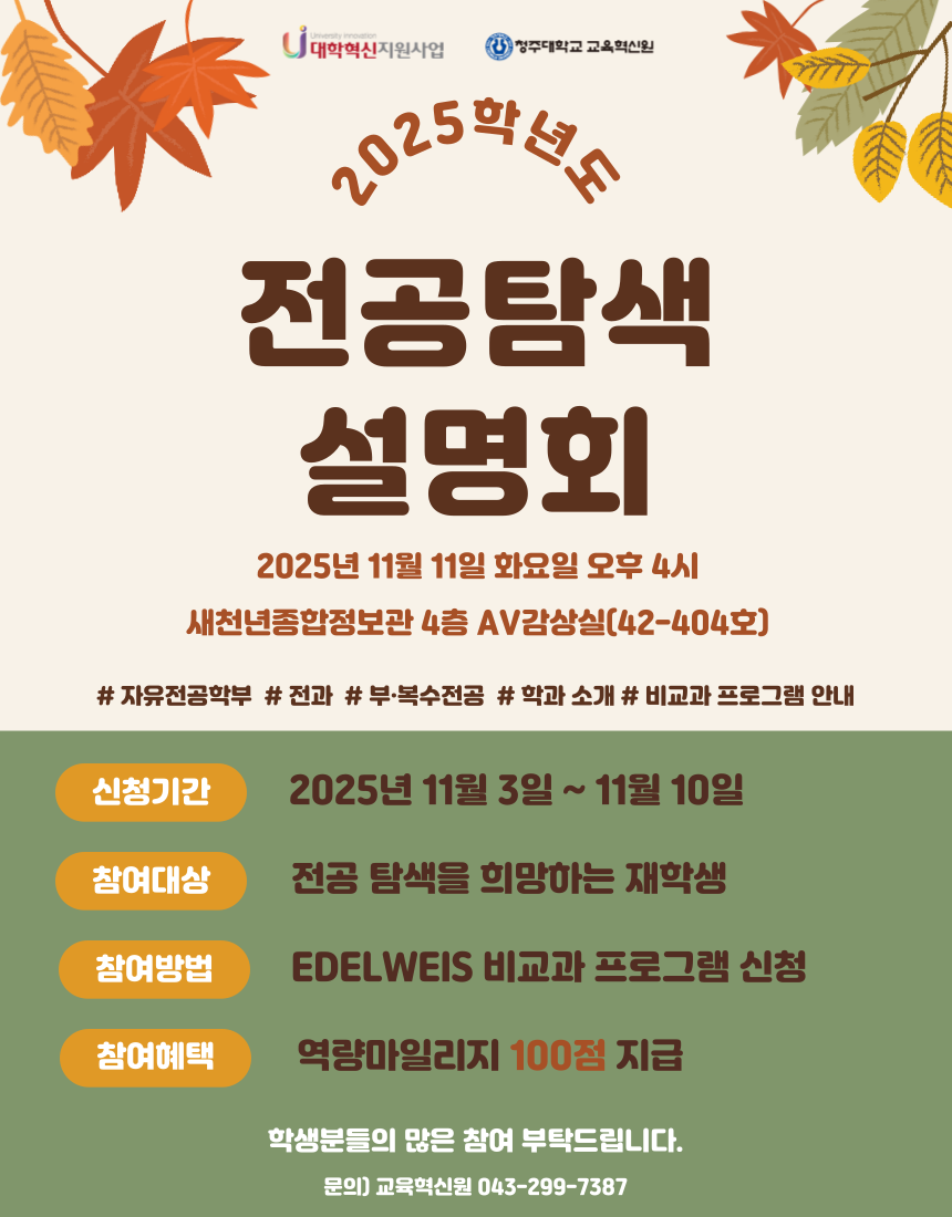 운영 장소: 새천년종합정보관 404호(AV감상실) 운영 대상 - 전공선택을 앞둔 자유전공학부 재학생 - 전과 및 부·복수전공을 희망하는 재학생 신청방법: EDELWEIS 비교과 프로그램 신청(~11/10까지) 참여 혜택: 역량마일리지 100점 지급 |